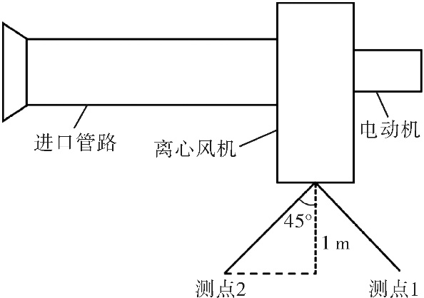 图1 试验及测点布置Fig.1 Layout of experimental and measuring points 采用型号为B&K4957麦克风,及相关的数据采集软件采集信号。试验时自然进气,在确认离心风机的运转已经平稳时采集时域数据,经快速傅里叶变换(FFT)得到2 000 Hz以下的不同频率的声压级。从图2测试结果可以看到,风机基频和二阶谐频的离散噪声明显,其基频的声压级为89 dB。左、右两侧的噪声频谱存在差异,主要是离心风机分布的不对称性,在进口段附近也存在噪声,因此测点2噪声频谱略高于测点1。
