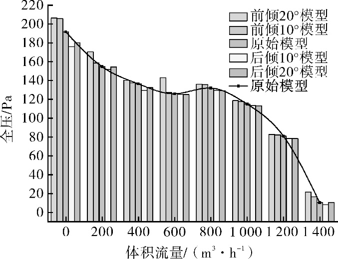 图8 风机气动性能试验及数值模拟对比Fig.8 Comparison of experimental and numerical simulation results on aerodynamic performance of the diagonal flow fan 3 导叶倾斜对风机气动性能的影响 在额定流量1 200 m3/h及额定转速1 200 r/min下,对 5 种不同导叶倾角(前倾 20°,10°,0°,后倾10°,20°)的风机模型进行数值模拟。绘制各风机模型的全压-流量和全压效率-流量曲线对比如图9~10所示,可以看出,导叶倾斜方向和角度对于风机全压和效率均有影响。在本文研究范围内,前倾导叶可提升风机整机性能,后倾导叶会恶化风机性能,同时可推测存在最佳前倾角度使得风机气动性能最佳。