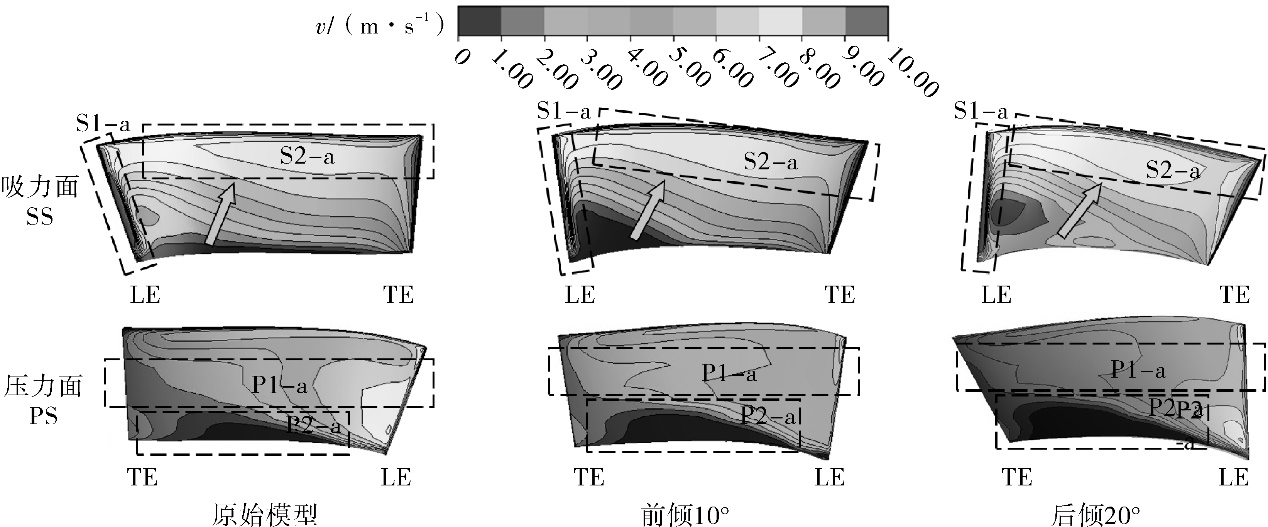 图12 后倾导叶与原始导叶表面流体径向速度对比Fig.12 Comparison of radial fluid velocity on the stator vane surfaces between the back-leaned and baseline models 综上所述,通过分析倾斜导叶的径向速度分布结果,验证了第1.2节所述的倾斜导叶性能优化方法。结果表明:前倾叶片能有效改善叶片表面的径向速度分布,增大压力面上处径向速度为0的区域,改善端部流体堆积,降低了能量损失,后倾导叶作用相反。 4.2 导叶近表面轴向速度影响分析及性能改进机理 图13,14分别示出前倾、后倾与原始导叶表面流体的轴向速度分布云图。同理,将叶片压力面、吸力面分别划分为2个特征区域,即P1-a、P2-a、S1-a、S2-a,箭头表示该方向的速度梯度。由图14可知:导叶前倾时,前缘P1-a区的轴向速度略微降低,表明前倾有助于缓解流体对导叶前缘的冲击;压力面上P2-a区和吸力面S2-a区轴向速度有所提升,低速区逐渐缩小,使得端壁区低能流体能够高速排出流道,改善堆积现象。同时,前倾角度增大使得压力面上流体的轴向速度梯度分布减小,降低了能量损失。吸力面上,叶高中部S1-a区形成了较为明显的“流通区”,有利于风机气动性能的提升。