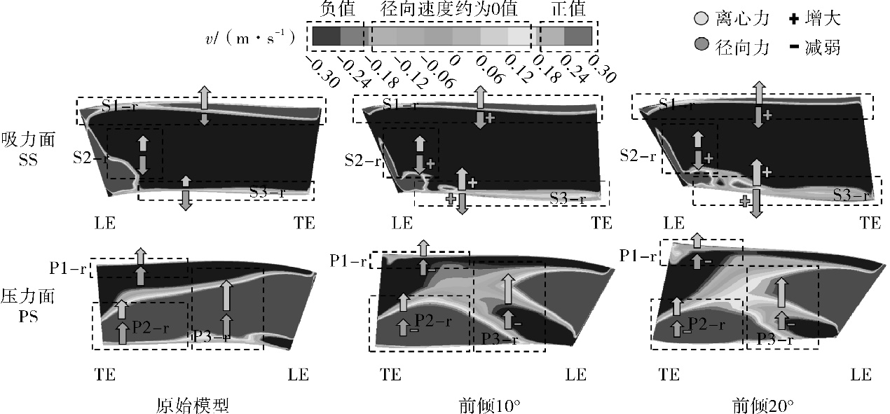 图10 5种导叶风机全压效率-流量曲线对比Fig.10 Comparison of the total pressure efficiency variation with volume flow rate for five stator models 图9中表明:前倾导叶可提高全流量区间(0~1 400 m3/h)的风机全压,在设计工况下可提升效率约2%,且前倾20°导叶对于非设计工况下的风机气动性能有显著提升,对实际运行中的风机偏工况性能有明显改善作用。在本文研究范围内,风机气动性能随导叶前倾角度增大而增大、随后倾导叶角度增大而降低,因此可以认为整体上前倾导叶有助于提高风机的气动性能,后倾导叶作用相反。 从图10中可看出:前倾20°对小流量(400~600 m3/h)区间及大流量(1 400 m3/h)的风机效率优化作用显著,在额定工况附近提升效果不明显;前倾10°可略微提升风机整机全压效率。后倾导叶将略微降低风机效率。 4 风机气动性能优化机理分析 4.1 导叶表面径向速度分布及理论验证 导叶表面流体的径向速度可以体现流体沿叶片表面的流动状态,借助第1.2节理论分析不同倾斜导叶表面的径向速度分布差异,可进一步得到倾斜导叶性能优化方法的量化指标。由图2可知:流体径向速度接近0值的区域面积越大,表征表面边界层移动微弱的区域越大,导叶叶型损失越小,越利于改善风机气动性能。 图11,12分别示出前倾、后倾与原始导叶模型表面径向速度分布对比。径向速度图例展示了3种不同的径向速度:负值、接近0值和正值,分别对应于第1.2节中流体下移、流体移动微弱、流体上移3种情况。由于流体在叶片表面不同区域的径向速度分布特征有明显差异,因此将导叶压力面和吸力面分为6个区域,分别为P1-r,P2-r,P3-r,S1-r,S2-r,S3-r区。同时,通过蓝、黄两种颜色的箭头的方向及长短分别表示径向力与离心力的方向与二者的相对大小。 前倾导叶与原始导叶表面流体径向速度对比如图11所示,通过“+”、“-”表示力的增大和减小。可以看出:压力面上,各区域径向力随着导叶前倾角度增加而增大,因导叶相对叶轮位置发生变化,P3-r区域流体离心力随前倾角度增大而增大,导叶P3-r区域径向速度约为0值的区域增大,扩大了轮缘附近表面边界层移动微弱的区域面积,改善了流体在端部的堆积;吸力面上,各区域径向力随前倾角度增大而减小,使S2-r、S3-r区域流体径向速度明显改变,叶片中部出现了大面积径向速度约为0值的流体,缓冲了叶片顶部与端部不同速度方向的流体冲击并减弱了该区域的速度梯度,减小了能量损失,提升了风机性能。